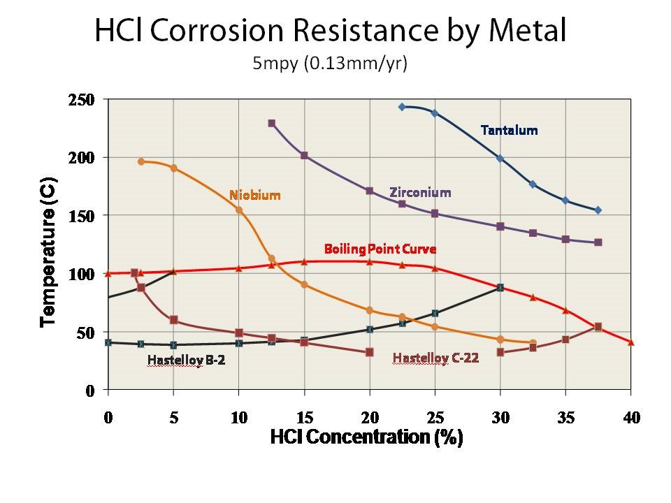 Tantalum Metal: The hydrochloric acid iso-corrosion curves show that tantalum metal has the best corrosion resistance when compared to other specialty alloys at any temperature and concentration including zirconium. For any concentration at temperatures less than 300F or (150C), tantalum has no corrosion rate in hydrochloric acid. This is why tantalum metal is ideal for HCl applications.